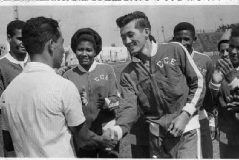 Cabo Alcides, parabenizando Ossamo Kurata, ouro e recorde no salto em altura nos Jogos Abertos, Bauru/1970. (Futebol Bauru/Arquivo)
